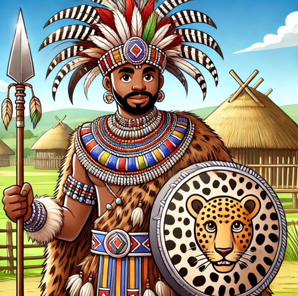 Soon, Sipho brought Captain PillowBelly to meet his father, who was one of the leaders of the village, and even the king himself! King Shaka was tall and proud, wearing a necklace made of colorful beads and carrying a special shield. Captain PillowBelly remembered reading that King Shaka was a great leader and warrior who helped make the Zulu people strong and united.