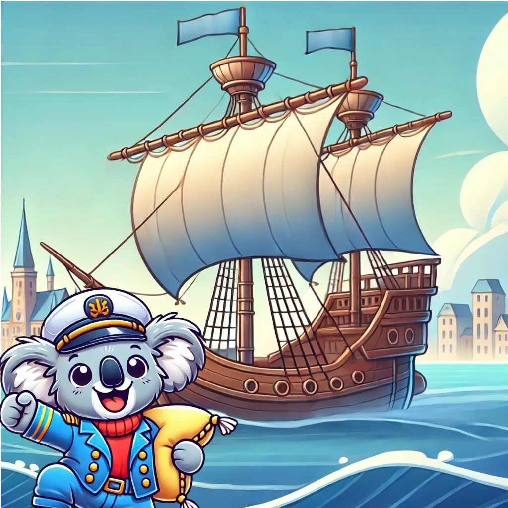 He’s a curious little koala with a pillow tucked under his captain’s jacket, a bottomless appetite for snacks and naps, and a heart full of wonder. He lives on his cozy ship, the Beluga — a wooden cog that sails from one country to the next.